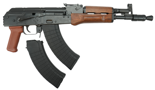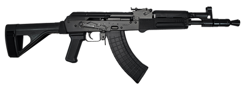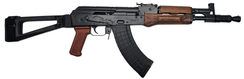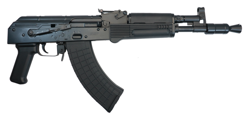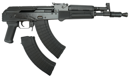 Semi-automatic AK-pattern pistol chambered in 7.62x39 with an 11.73" threaded barrel and forged trunnion construction. Features adjustable post front and blade rear sights, polymer furniture, side-mounted optics rail, and includes two 30-round magazines. Weighs 6.32 lbs with an overall length of 22.93".