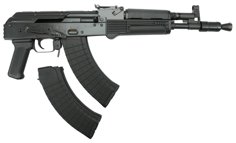Semi-auto AK-pattern pistol chambered in 7.62x39mm with an 11.73" threaded barrel and 30-round magazine capacity. Features a forged trunnion design, adjustable rear sights, side-mounted optic rail, rear Picatinny rail, and polymer furniture. Includes two 30-round magazines and weighs 6.32 lbs.