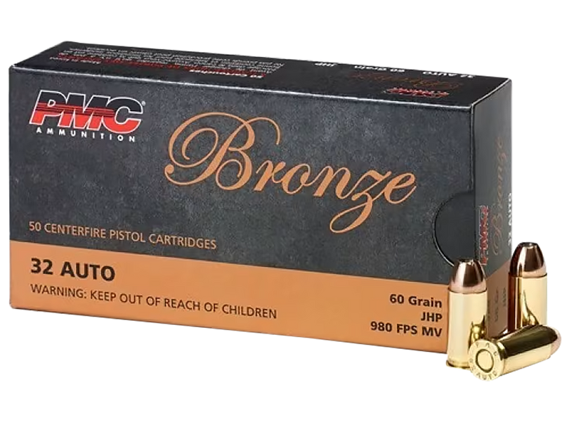 PMC Bronze 32 ACP ammunition features 60 grain Jacketed Hollow Point bullets at 980 fps muzzle velocity delivering 117 ft-lbs of energy. This brass-cased, boxer-primed ammunition is suitable for target shooting and personal protection, with each round electronically measured for consistent powder charges within two-tenths of one grain variance.