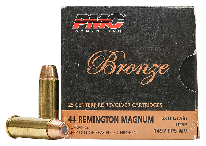 .44 Rem Mag centerfire handgun ammunition loaded with 240 grain truncated cone soft point bullets, delivering 1497 fps muzzle velocity and 1194 ft-lbs of energy. Brass cased with boxer primer, suitable for hunting and target shooting applications. PMC Bronze ammunition undergoes rigorous quality control with electronic powder measurement to ensure consistent performance.