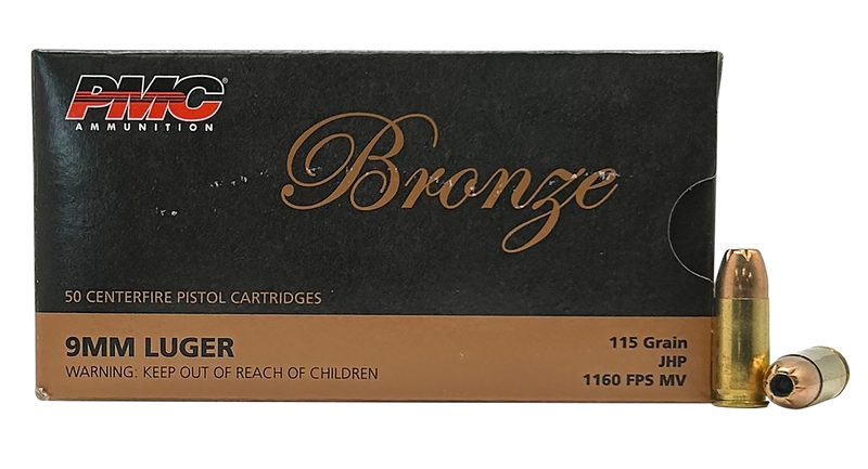 PMC Bronze 9mm Luger ammunition features 115 grain jacketed hollow point bullets with a muzzle velocity of 1160 fps and 344 ft-lbs of energy. Each round is loaded with brass casings and boxer primers, undergoing rigorous quality control with electronically measured powder charges. Ideal for target shooting and training applications.