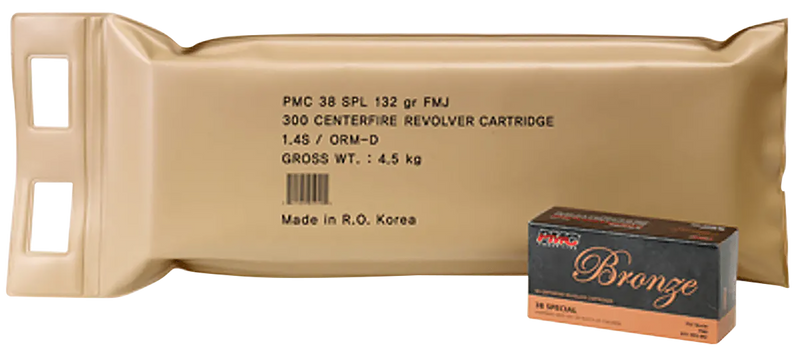 PMC Bronze Battle Pack ammunition in 38 Special features 132 grain Full Metal Jacket bullets loaded to 917 fps with 232 ft-lbs of muzzle energy. This brass-cased, boxer-primed ammunition is packaged with 300 rounds per box and meets rigorous inspection standards for reliable sport shooting performance.