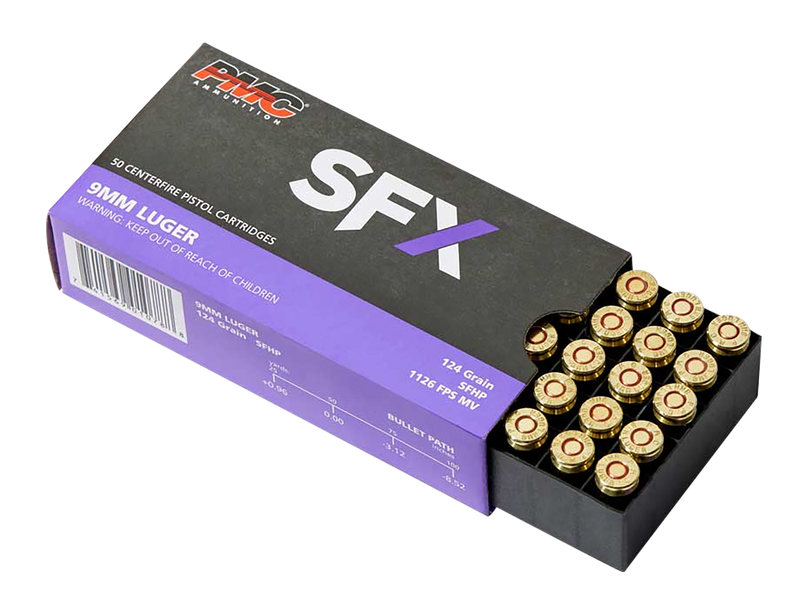 PMC 9SFX ammunition in 9mm Luger features 124-grain StarFire hollow point bullets designed for self-defense and home defense applications. The round achieves 1201 fps muzzle velocity with 397 ft-lbs of energy, and demonstrates excellent expansion performance with stable penetration depth validated through FBI protocol testing. Brass casing with smokeless powder in 50-round boxes.