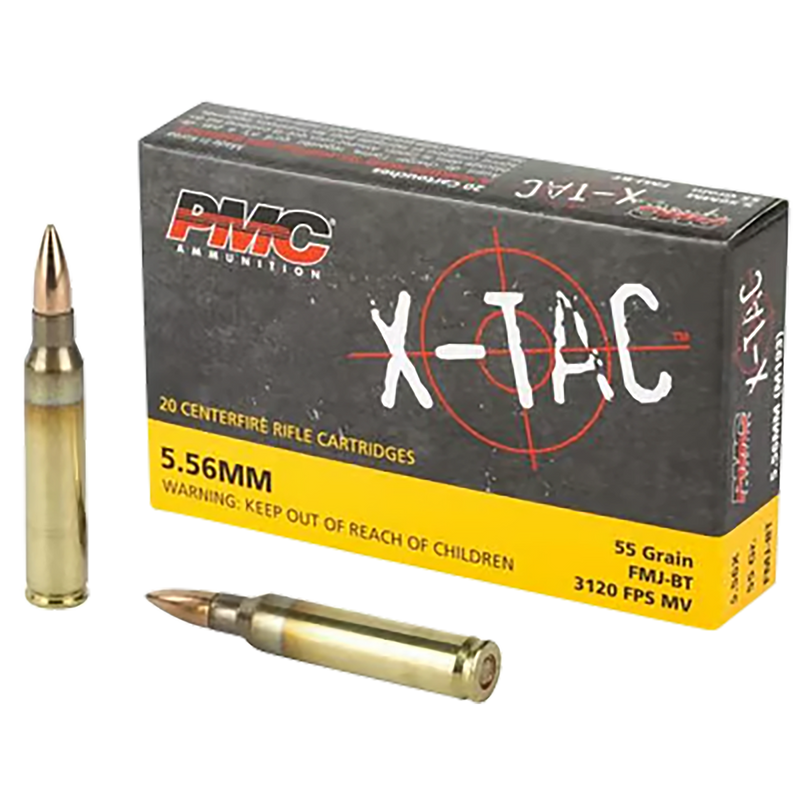 PMC X-Tac Battle Pack ammunition in 5.56x45mm NATO with 55-grain full metal jacket boat tail bullets. Delivers 3,120 fps muzzle velocity and 1,306 ft-lbs of energy from brass cases, suitable for target shooting and training. Sold in 200-round boxes with 5 boxes per case.