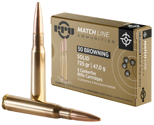 PMC X-Tac Match ammunition in .50 BMG caliber features 740-grain solid brass bullets designed for competition and precision target shooting. This match-grade ammunition delivers 2830 fps muzzle velocity and 13337 ft-lbs of energy with a ballistic coefficient of 0.909 for consistent long-range performance.