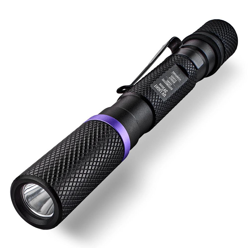 Ultra-slim UV flashlight with 395nm wavelength designed to detect and inspect materials not visible under normal lighting, including automotive leaks, machinery fluids, pet urine, and blood. Constructed of lightweight anodized aluminum with a single LED bulb, powered by 2 included AAA batteries for up to 6 hours of runtime. Features tail cap on/off switch, water-resistant construction, and carries a manufacturer's limited lifetime warranty.