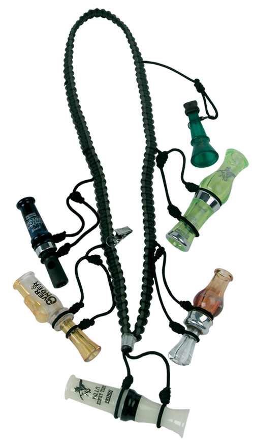 This hand-crafted lanyard features seven double-loop drops with heavy-duty black swivel snaps, allowing you to securely attach and organize up to seven waterfowl calls or whistles. Constructed from durable 550 paracord with an adjustable, widened neck strap designed for all-day comfort during hunting. The versatile setup accommodates any hunting scenario with customizable configuration options.