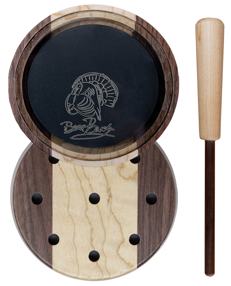 The Beau Brooks Signature Series Crystal Pot Call features a curly maple laminated pot with crystal over slate soundboard, hand-built by artist Jason Powell. This turkey call produces a sharp high-pitched front end with smooth rollover, suitable for locating gobblers at distance or close-range finessing. Designed for turkey hunting applications with easy difficulty level.