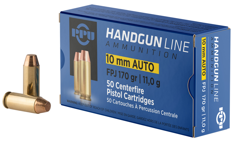 PPU 10mm Auto handgun ammunition with 170gr flat point jacketed bullets delivering 1115 fps muzzle velocity and 469 ft-lbs of energy. Features brass casing, boxer primer, and non-corrosive construction designed for reliable performance in home defense applications. Sold in 50-round boxes.