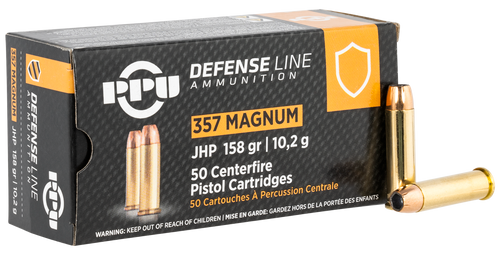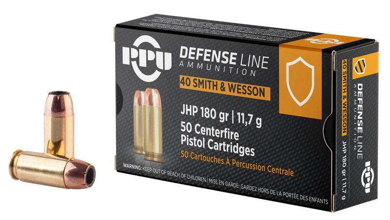 PPU Defense 40 S&W ammunition features 180-grain jacketed hollow point bullets loaded to 967 fps with 374 ft-lbs of muzzle energy. This centerfire handgun ammo is designed for home defense applications and comes in boxes of 50 rounds with brass cases suitable for reloading.