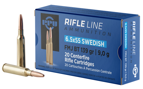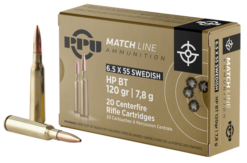 PPU Match 6.5x55 Swedish centerfire rifle ammunition loaded with 120gr hollow point boat tail bullets at 2720 fps muzzle velocity and 1989 ft-lbs of energy. Designed for target shooting and competition with exacting specifications and uniform quality primers for consistent accuracy at varying distances. Brass-cased, boxer-primed, and reloadable.