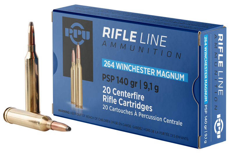 PPU 264 Win Mag centerfire rifle ammunition loaded with 140-grain Pointed Soft Point bullets. Delivers 3,018 fps muzzle velocity and 2,832 ft-lbs of energy, ideal for hunting medium to large game. Brass casing, 20 rounds per box, 10 boxes per case.
