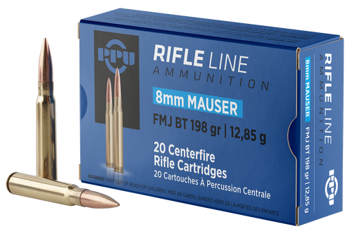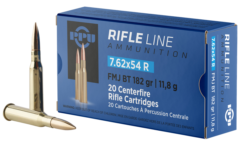 PPU 7.62x54mmR rifle ammunition with 182-grain full metal jacket boat tail bullets designed for target shooting and general rifle use. Features brass casing with a muzzle velocity of 2625 fps and muzzle energy of 2784 ft-lbs. Sold in 20-round boxes with 10 boxes per case.
