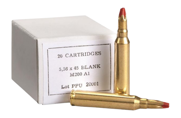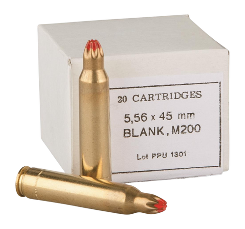 PPU 5.56x45 NATO blank rounds designed for military training, airsoft, and ceremonial use. These M200 A1 specification blanks come in 20-round boxes and use brass casings.