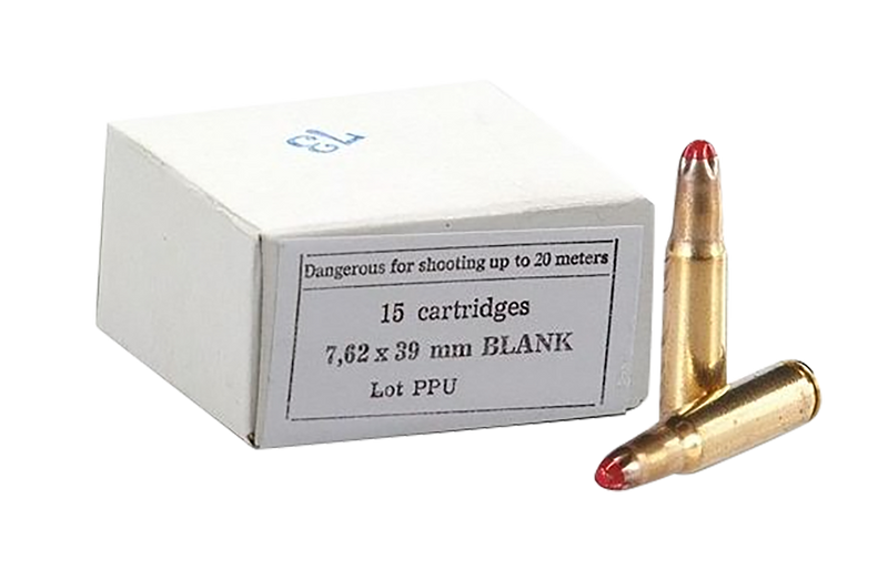 PPU PPB739 blank ammunition in 7.62x39mm caliber, loaded with 15 rounds per box. Designed for training and simulation exercises, these blanks produce noise and flash without projectiles. Hazmat shipping applies.