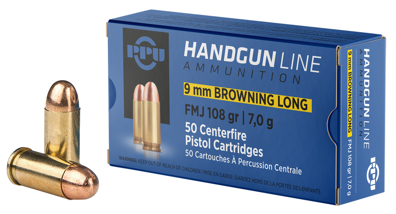 PPU 9mm Browning Long ammunition loaded with 108-grain full metal jacket bullets. Delivers 1148 fps muzzle velocity and 316 ft-lbs of energy from a brass casing. Sold 50 rounds per box, 20 boxes per case.