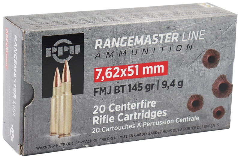 PPU RangeMaster 7.62x51 NATO centerfire rifle ammunition loaded with 145-grain full metal jacket boat tail bullets. Delivers 2835 fps muzzle velocity and 2587 ft-lbs of energy, with reloadable brass cases and Boxer primers. Sold in 20-round boxes.