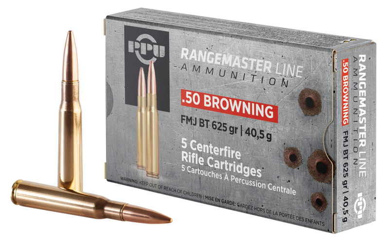 PPU Rangemaster .50 BMG ammunition features 625 grain full metal jacket projectiles loaded to 2940 fps, delivering 11994 ft-lbs of muzzle energy. Manufactured to military specifications with brass cases and Boxer primers. Sold in 5-round boxes, 20 boxes per case.