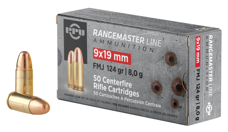 PPU Rangemaster 9mm Luger ammunition features 124 grain full metal jacket bullets loaded to 1132-1263 fps with 439 ft-lbs of muzzle energy. Manufactured with brass cases and Boxer primers, this target-grade ammunition is suitable for range shooting and training. Sold in 50-round boxes with 20 boxes per case.