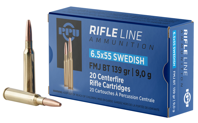 PPU 6.5x55 Swedish centerfire rifle ammunition loaded with 139-grain full metal jacket boat tail bullets. Delivers 2540 fps muzzle velocity and 1991 ft-lbs of energy, suitable for target shooting and general rifle use. Boxer-primed brass cases are reloadable.
