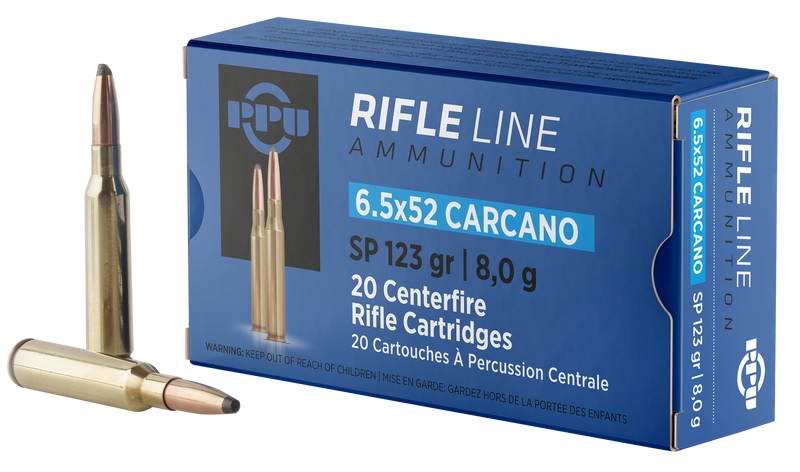 PPU 6.5x52mm Carcano centerfire rifle ammunition loaded with 123-grain soft point bullets. Delivers 2690 fps muzzle velocity and 1977 ft-lbs of energy, suitable for hunting and target shooting applications. Brass cases with Boxer primers are reloadable.
