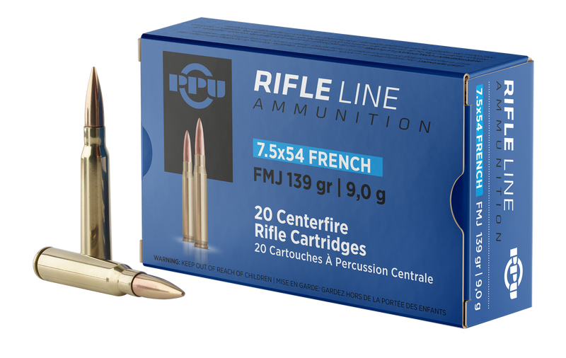 PPU 7.5x54mm French centerfire rifle ammunition loaded with 139-grain full metal jacket bullets. Delivers 2600 fps muzzle velocity and 2086 ft-lbs of energy with brass cases suitable for reloading. Designed for target shooting and general rifle use.