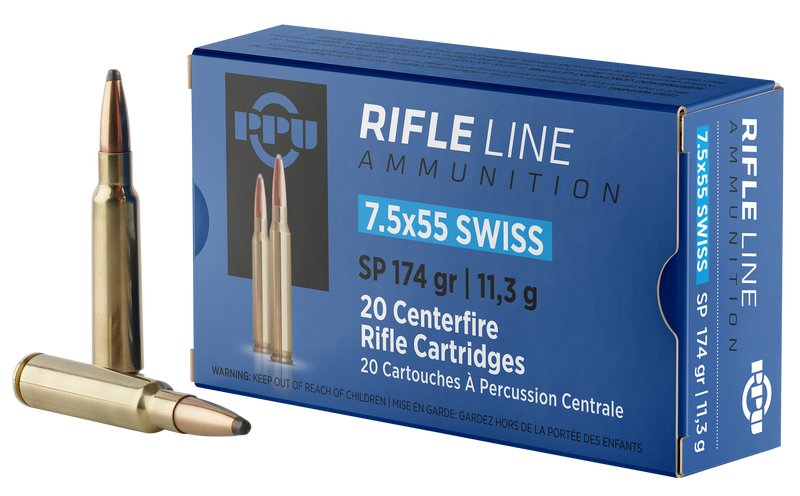 PPU 7.5x55mm Swiss centerfire rifle ammunition loaded with 174-grain soft point bullets. Delivers 2525 fps muzzle velocity and 2477 ft-lbs of energy from brass cases with Boxer primers. Suitable for target shooting and hunting applications.