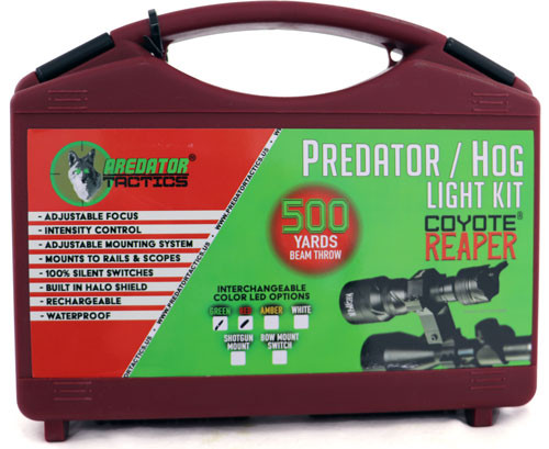 The Predator Tactics Coyote Reaper Rifleman Double LED Kit features dual LED outputs in red and green wavelengths, designed for rifle-mounted applications. This kit provides versatile illumination options for hunting and tactical use. The dual LED configuration allows users to switch between red and green light sources for different hunting scenarios.