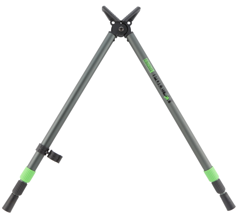 The Primos Pole Cat is a lightweight aluminum bipod with a height range of 16-38 inches, featuring a removable rotating yoke and all-terrain feet for stable shooting support. It includes a wrist strap and tactile rubber V-grips, with patented Posi-Lock adjustment that allows silent terrain adjustment via quarter-twist. The seamless tempered-aluminum construction provides excellent strength-to-weight ratio at approximately 14.4 ounces.