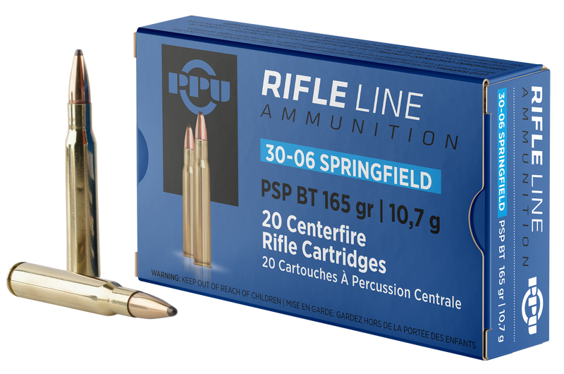 PPU 30-06 Springfield centerfire rifle ammunition with 165 grain Pointed Soft Point Boat Tail bullets. This ammunition delivers 2800 fps muzzle velocity and 2872 ft-lbs of energy, making it suitable for hunting applications. Brass casing, boxer primer, reloadable.
