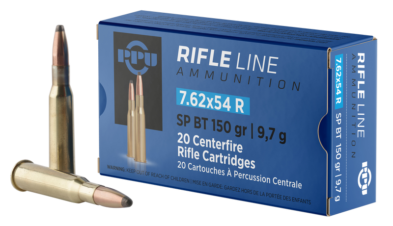 PPU 7.62x54R rifle ammunition loaded with 150-grain soft point boat tail bullets. Delivers 2840 fps muzzle velocity and 2686 ft-lbs of energy, suitable for target shooting and medium to large game. Brass casing, boxer primed, and reloadable.