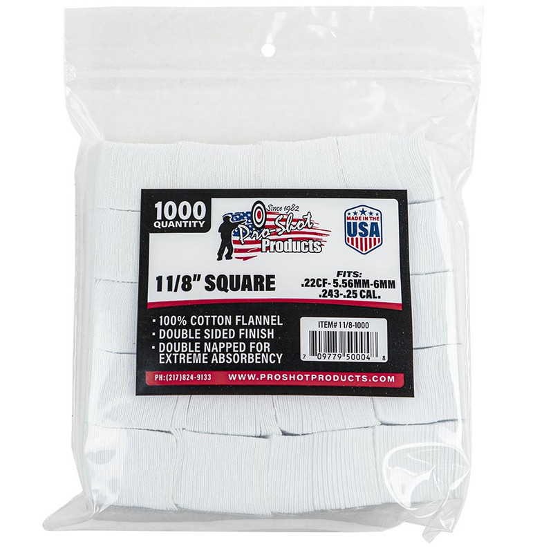 These 1 1/8" square patches are made from American-grown, 100% cotton flannel and designed for use with firearms chambered in .22 caliber through .270 caliber. The patches feature Pro-Shot's exclusive Superior Weave Technology (SWT) for improved fouling absorption and are finished on both sides for maximum absorbency with all solvent types. Each package contains 1,000 patches.