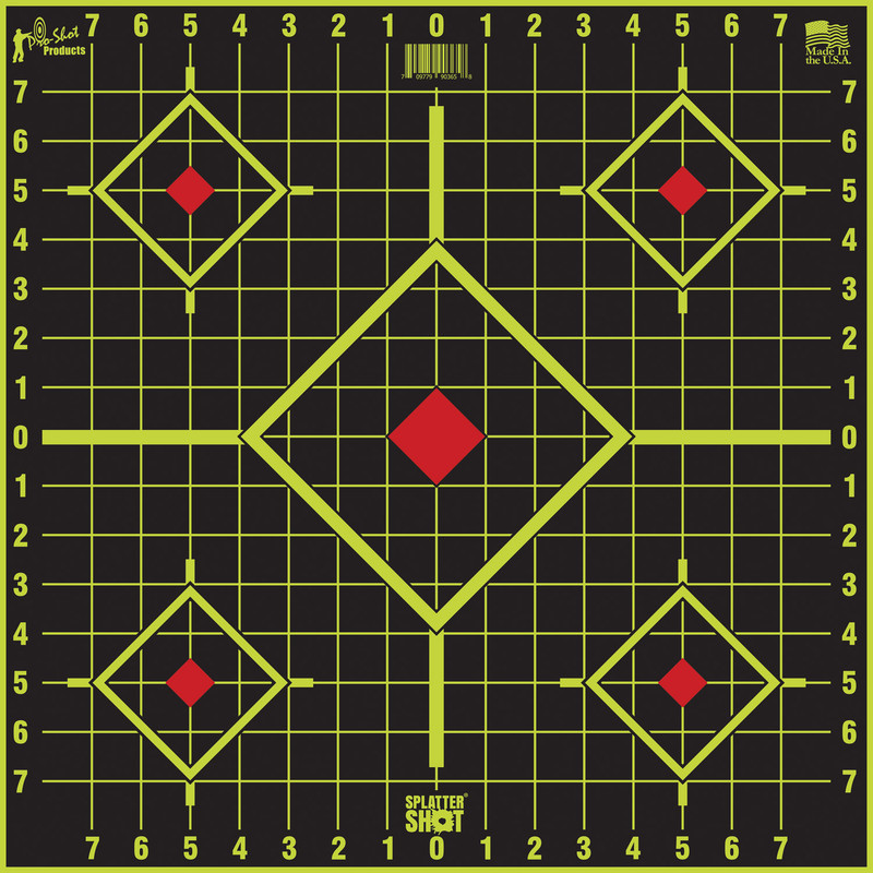 Five-pack of 17.75" x 17.75" self-adhesive paper sight-in targets featuring a 5-diamond pattern with splatter technology for enhanced bullet impact visibility. Designed for long-range zeroing and sighting applications. Black and green color scheme provides high contrast for accurate shot placement feedback.