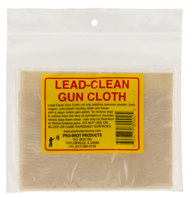 Treated cotton cloth designed for removal of lead, carbon, copper, and plastic fouling from firearm surfaces. Can be cut into patches for cleaning cylinder faces, muzzles, and other gun components. Contains lead-removing treatment and is subject to hazmat shipping restrictions.