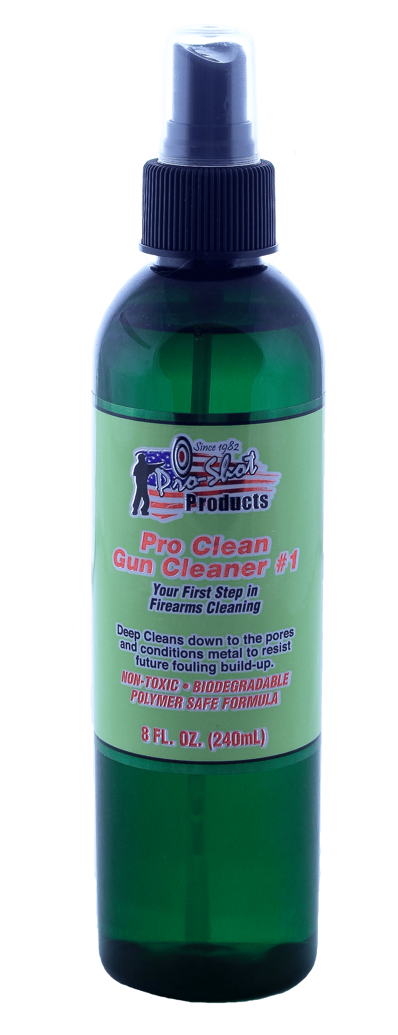 Pro-Shot PC8 Pro-Cleaner #1 is an 8 oz. spray bottle solvent designed to clean firearms and protect against rust and corrosion. The product is eco-friendly and classified as hazmat, indicating it contains active cleaning agents suitable for professional gun care and maintenance.
