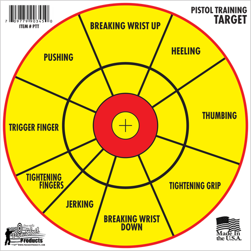 This 12-pack of Pro-Shot sight-in targets features heavy paper construction with black and white aiming points designed for 100-yard shooting distances. Each target measures 14" x 14" and includes a hanging mount for easy setup on range stands or frames. Ideal for rifle zeroing and precision shooting practice.