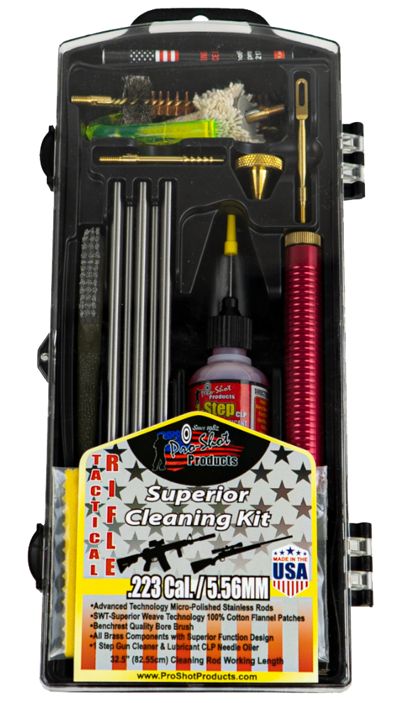 A complete cleaning kit designed for AR-15 and M16 rifles chambered in .223 Remington/5.56 NATO. The kit includes premium stainless steel micro-polished cleaning rods (5 qty, 6.5" length), brass patch holder, bore brushes, chamber brush and mop, brass jag, muzzle guard, CLP lubricant, cleaning patches, and nylon bristle brush. Packaged in a black plastic carrying case for organization and portability.
