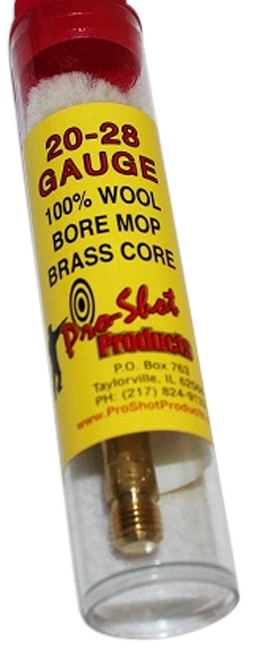 100% cotton bore mop with brass core designed for 20 and 28 gauge shotguns with American standard #5/16-27 threads. Features Pro-Shot's exclusive quick clean/mop design and thick cotton fill for effective bore cleaning and lubrication. Made in the USA.