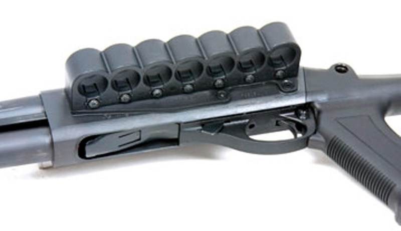 Advanced tactical stock system designed for Remington 870 12-gauge shotguns, featuring a six-position collapsible butt-stock for customizable fit and comfort. Constructed from lightweight carbon-fiber reinforced polymer that is weather-resistant and compatible with standard gun solvents and oils. Includes integrated shell carrier for convenient ammunition storage.