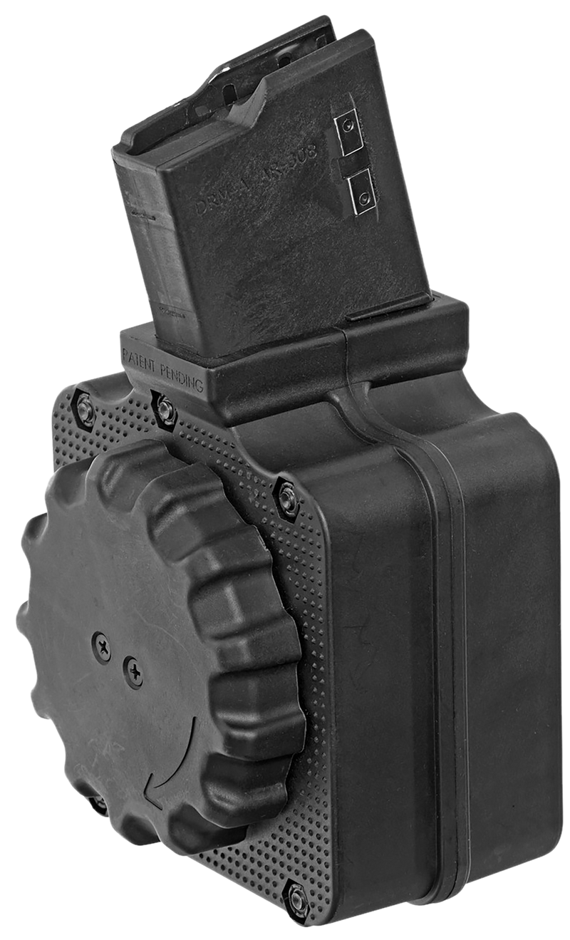 This 50-round drum magazine is designed for AR-308/.308 Win rifles using LR-308 (DPMS) or SR-25 pattern magazines. The magazine features a DuPont Zytel polymer body with over-molded stamped steel feed lips, an injection-molded follower, and heat-treated stainless steel spring. Made in the USA with a patented design, it does not fit Armalite pattern magazines.