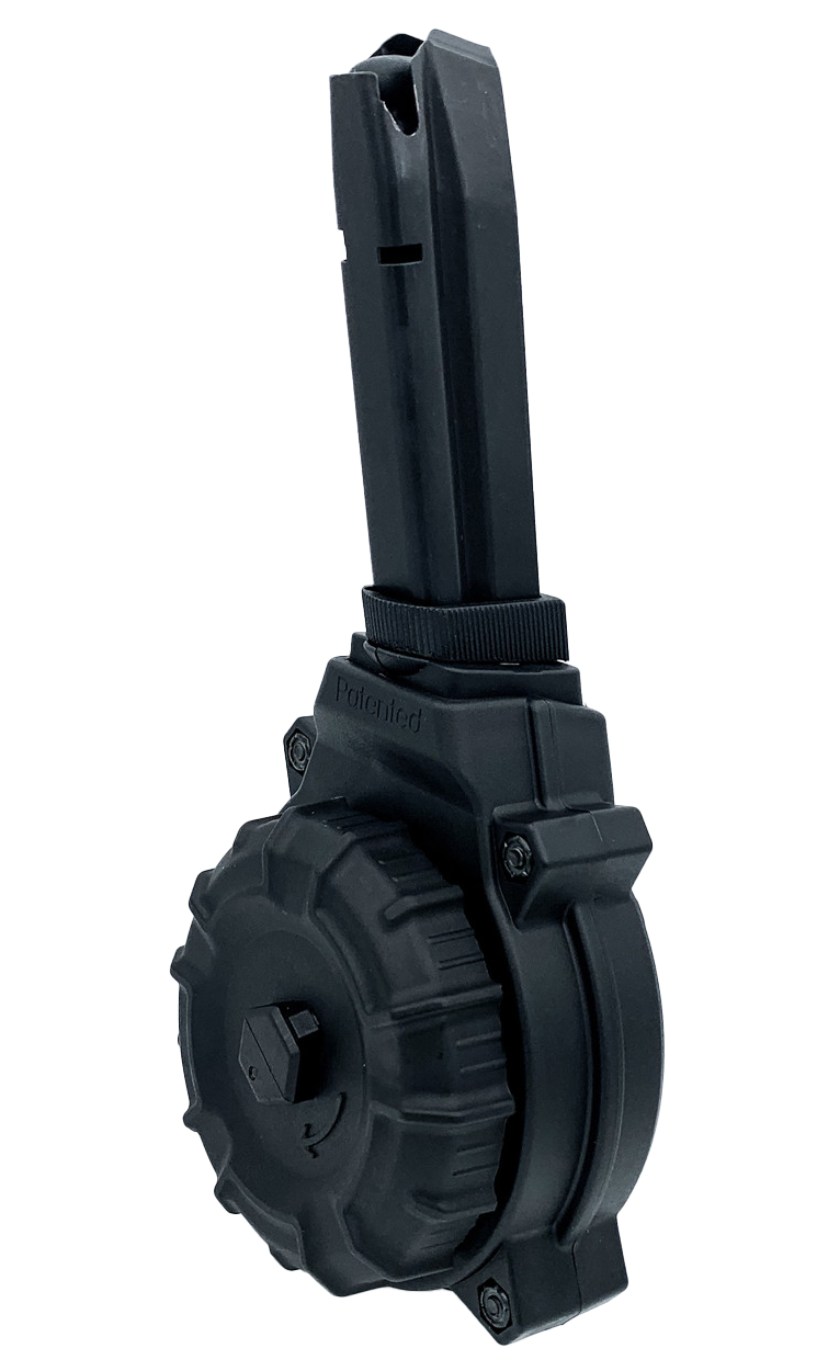 ProMag DRMA56 is a 50-round drum magazine designed for the Browning Hi-Power (P-35) in 9mm. Constructed from DuPont Zytel-based polymer with a blue steel upper tower, heat-treated stainless steel spring, and injection-molded follower, made in the USA.