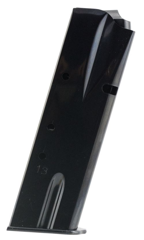 A 13-round detachable magazine for the Browning Hi-Power/P35 pistol chambered in 9mm Luger. Constructed from heat-treated blued steel with a proprietary DuPont Zytel-based polymer follower and base plate, featuring a chrome-silicon spring for reliable feeding. Made in the USA.