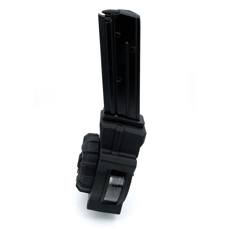 This 55-round drum magazine is designed for the FN Five-seveN USG pistol chambered in 5.7x28mm. The magazine features a proprietary DuPont Zytel polymer body with a blue steel upper tower, injection molded follower, and heat-treated stainless steel spring. Made in the USA.