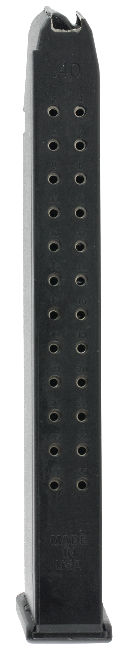 This double-stack magazine loader is designed for Glock 9mm Luger and .40 S&W magazines with top dimensions of 1 5/16" x 1" or smaller. Constructed from black polymer, it reduces finger fatigue when loading magazines and is compatible with Glock 9 and 40 caliber models.