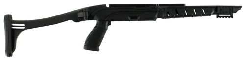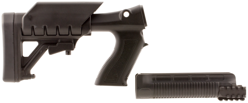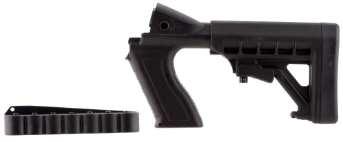 This tactical pistol grip stock system is designed for the Remington 870 shotgun and features a carbon fiber-reinforced polymer construction that resists weather and gun solvents. The six-position collapsible buttstock offers adjustable length of pull from 11" to 14.25", with an integrated cheekrest for improved ergonomics and shooting comfort.