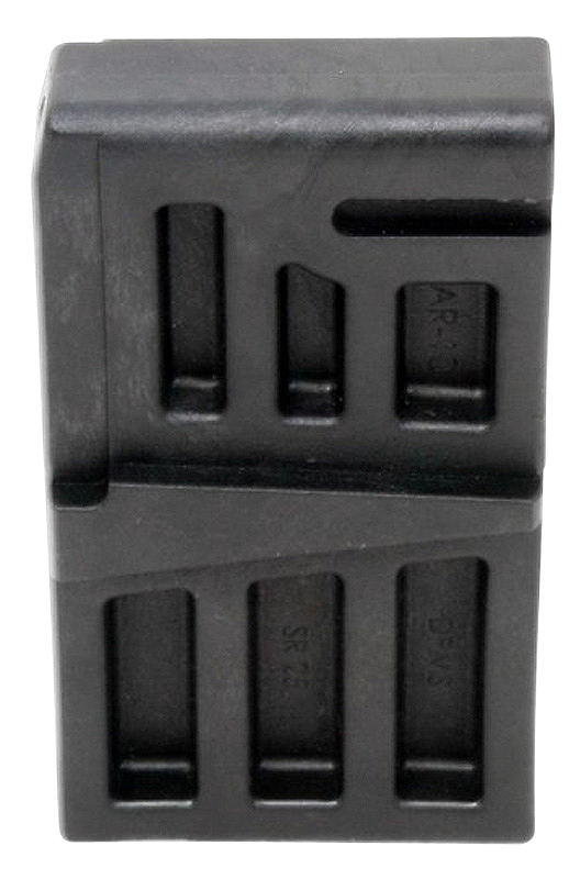 A heavy-duty polymer vise block that securely clamps into the magazine well of AR-10 lower receivers to prevent damage during repair, assembly, and cleaning. Features a double-sided design compatible with ArmaLite, DPMS, Remington, SR-25, and other .308 Win/7.62 NATO AR-10 variants. Constructed from injection-molded black polymer with dimensions of 5.2" L x 3.0" W x 1.7" H.