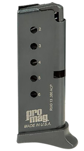 ProMag RUG13 is a 6-round detachable magazine designed for the Ruger LCP chambered in .380 ACP. Constructed from heat-treated blued steel with a proprietary DuPont Zytel-based polymer follower and base plate, featuring a chrome-silicon spring for reliable feeding and durability.