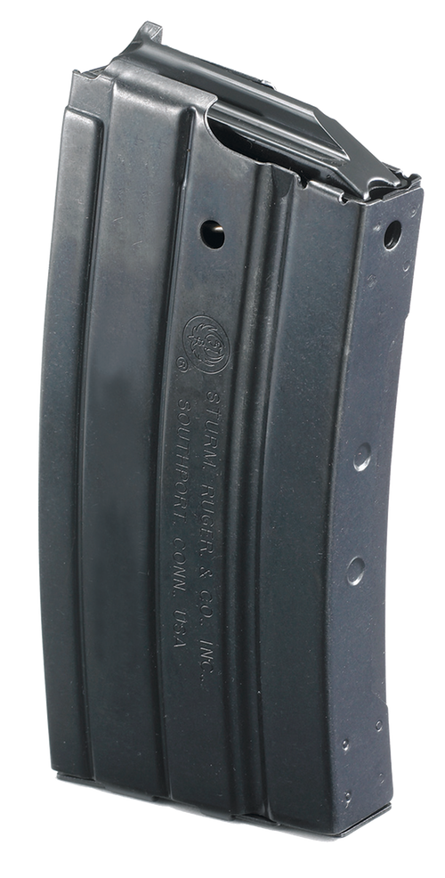 A 20-round detachable magazine for Ruger Mini-14 rifles chambered in .223 Rem/5.56x45mm NATO. The magazine features a heat-treated steel body with black oxide blued finish, chrome-silicon wire spring, and precision-molded polymer follower for reliable feeding and field durability.