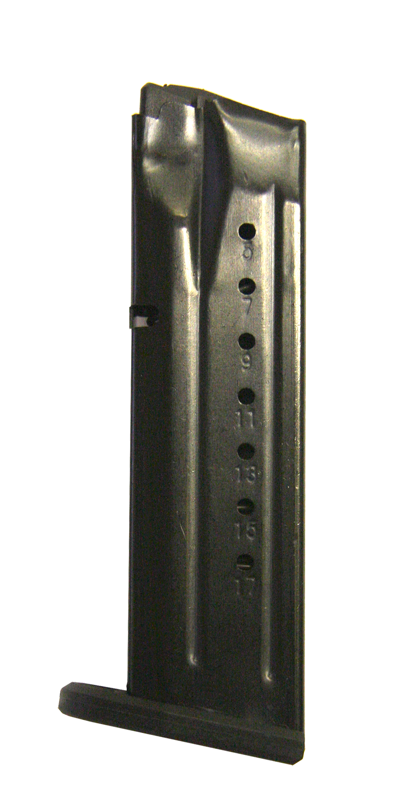 10-round detachable magazine designed for Smith & Wesson M&P 9mm pistols. Constructed from heat-treated blued steel with an injection-molded polymer follower and chrome-silicon wire spring. Made in the USA.