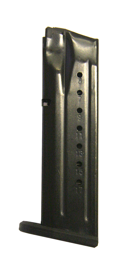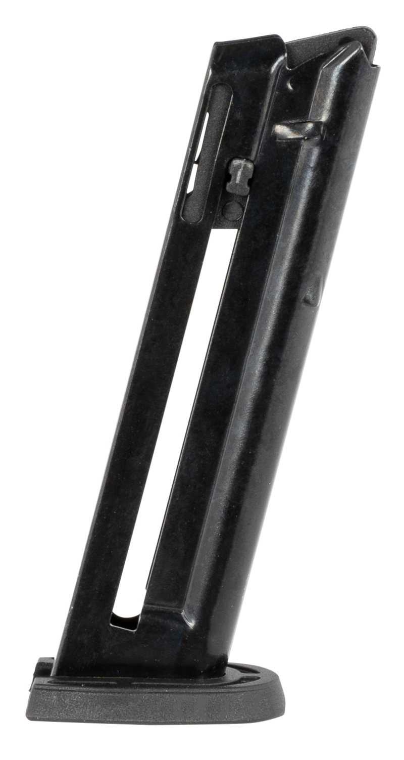 10-round magazine chambered in .22 LR, designed to fit Smith & Wesson M&P 22 series pistols. Features a heat-treated steel body with black oxide/blued finish, injection-molded follower, and heat-treated chrome silicone wire spring. Made in USA.